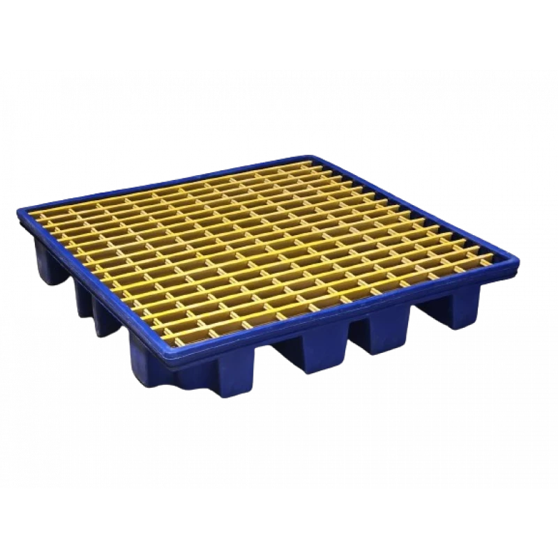 . Load capacity: 200 to 1500 kg depending on model . Sump capacity: 100 to 250 liters . Material: LLDPE / HDPE / Powder-coated steel . Dimensions: Customizable for standard drum sizes . Grid type: Anti-slip removable grating . Color options: Yellow, blue, black (visibility and coding) . Optional: Drain plug for easy emptying